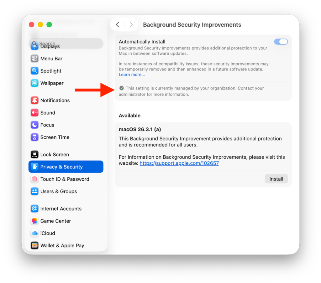 With the new Update Settings Declaration with Automatic Actions you will see that the Privacy & Security settings, Background Security Improvements section is now managed and auto install is enforced and can not be modified by the end user.