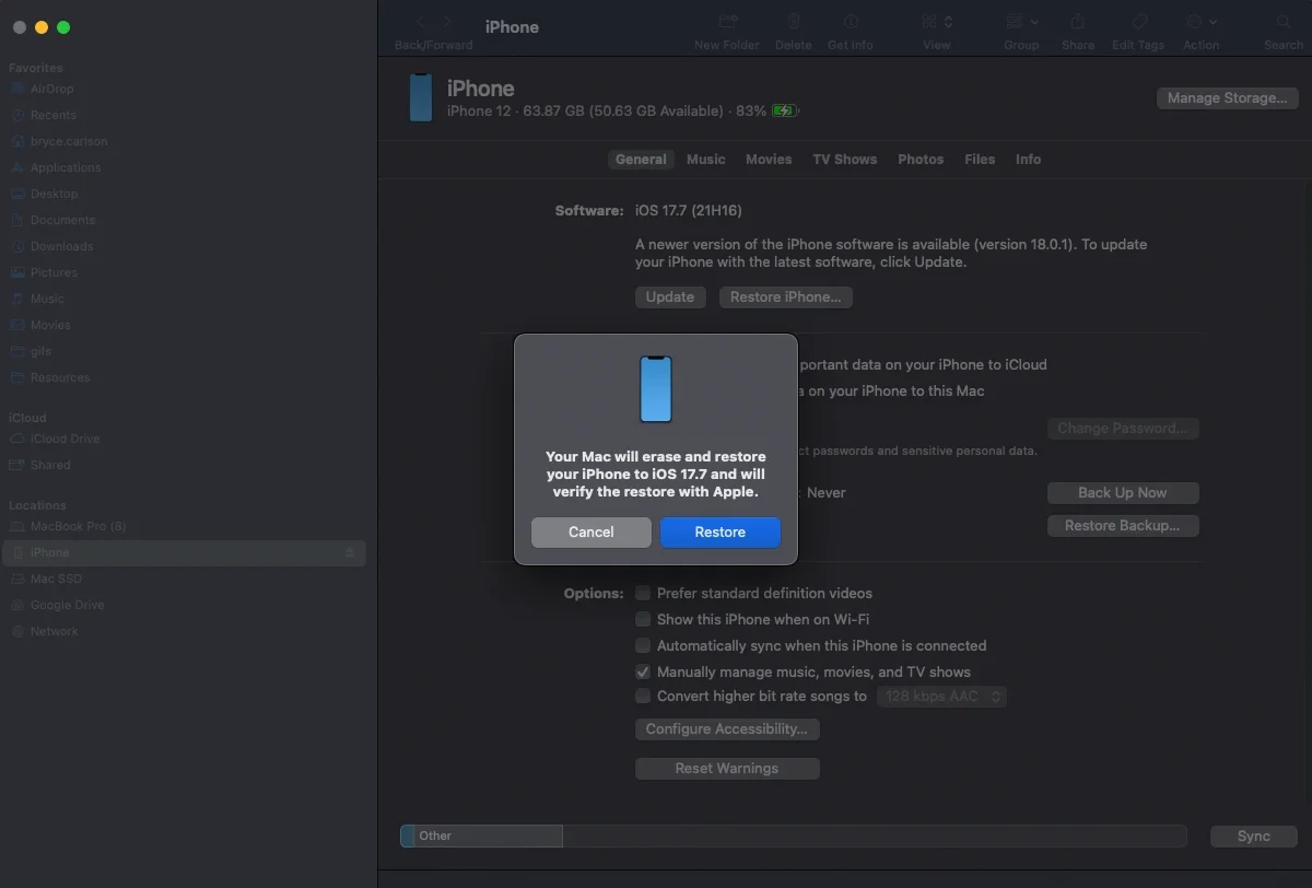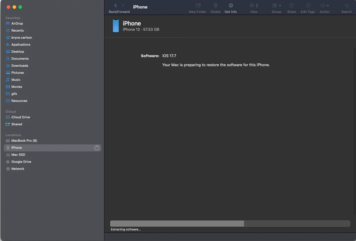 With the device showing in Finder.app and your desired IPSW file downloaded locally to your macOS device you can start the restore. In Finder.app you will notice that it shows what version the device is on now, and if an update is available (if a newer OS exists GA/Public). We are not going to pick that default option, we are going to instead hold down the option key on the keyboard and then click the Restore iPhone… (or iPad etc.) button with the option key still depressed. This will allow us to pick the IPSW file for our specific version of iOS/iPadOS from our restore host macOS device’s file structure.