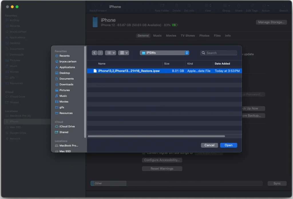 Select the desired IPSW file